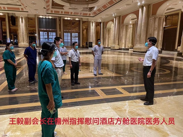 海南省医学会副会长、海南医学院第二附属医院党委书记王毅走访气膜实验室在儋州指挥慰问酒店方舱医院医务人员。