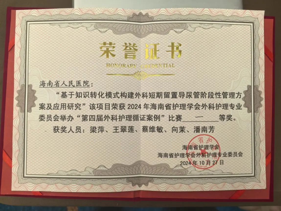 海南省人民医院护理团队参赛的循证实践项目《基于知识转化模式构建外科短期留置导尿管阶段性管理方案及应用研究》,在激烈的角逐中脱颖而出,荣获一等奖。这一成绩不仅体现了海南省人民医院在护理实践与研究中卓越的创新能力,以及临床决策的科学性,更是对医院护理团队不懈努力的极大认可。